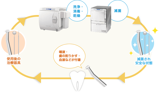 使用後の治療器具には、患者様の血液やだ液などが付着しているため、もしも患者様が感染症を持っていた場合、適切な処理が行われなければ、次にその器材を使用される患者様に感染してしまう恐れがあります(院内感染)。