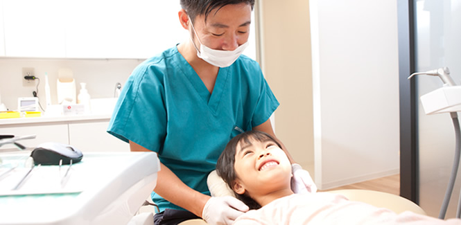 当診療室ではまず治療する際、充分に子供と対話を取り無理に治療することはしません。まずは歯ブラシなどでお口の中に物が入るのが慣れてから治療するなど、お子さんが歯医者が嫌いにならなような工夫をしています。